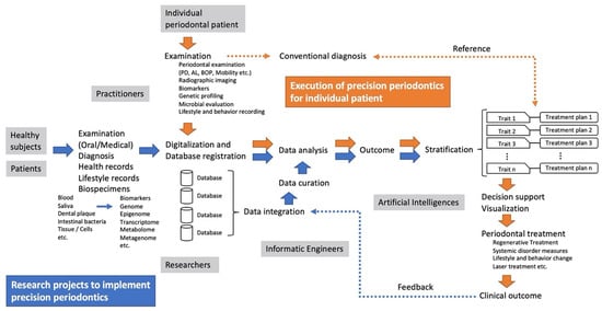 T Conceptual flow chart of precision periodontics. Precision periodontics is the future of periodontal therapy. To realize this vision, it is first necessary to promote the numerous research projects that are currently being conducted in various fields and then to stratify the disease based on the results of these projects. The stratification will be based on traits that are not restricted to the current periodontal disease classification. Finally, each trait needs to be linked to the appropriate treatment (blue flow). However, when precision periodontics is actually executed on an individual patient, data necessary for stratification are first collected from the patient through examinations and are analyzed in conjunction with existing data in the database to determine into which trait category the patient falls. Then, the appropriate treatment for that trait is proposed, and the patient is treated accordingly. The process is automated by artificial intelligence, which supports the decision-making of the clinician (orange flow). The outcomes of the treatment can be fed back to the database to help update the curation of data.