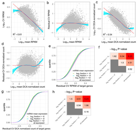 Previous studies have described a general tendency of decreasing the expression noise of mRNAs, when the mean expression level increases [25,26]. We observed that the mean and CV of normalized counts such as RPKM always showed a linear relationship in the logarithmic scale (Figure 1a and Figure A1a,i). To account for the effect of the mean expression level, we calculated RCV by subtracting the confounding mean (Figure 1b and Figure A1b,j). Accordingly, RCV measures the relative noise of one mRNA compared with the mean noise of another mRNA with the same expression level. We assume that RCVs of mRNAs should be reduced if the mRNAs are targeted by highly expressed miRNAs.
