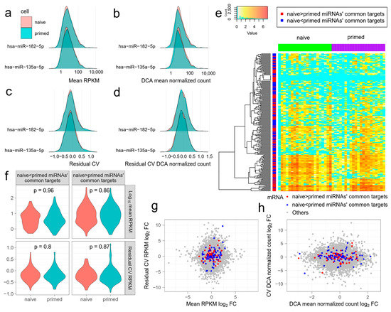The effect of differentially expressed miRNAs on mean expression level and the noise of target mRNAs. miRNA and mRNA data are from GSE81287 naive and primed embryonic stem cells (ESCs). (a–d) Distributions of mean expression level ((a) mean RPKM, (b) mean DCA normalized count) and noise of mRNAs ((c) residual coefficient of variation (RCV) RPKM, (d) RCV DCA normalized count) targeted by differentially expressed miRNAs. hsa-miR-182-5p and hsa-miR-135a-5p are representative differentially expressed miRNAs, with higher expression in naive and primed ESCs, respectively. The distributions are almost identical in naive and primed ESCs. (e) Log(#count + 1) of the commonest mRNAs targeted by differentially expressed miRNAs in naive and primed ESCs. MRNAs targeted by miRNAs with higher expression in naive and primed ESCs have similar patterns. Zero expression is shown in cyan. (f) Violin plots showing the mean expression levels and noises of the commonest mRNAs targeted by differentially expressed miRNAs in naive and primed ESCs. (g,h) The log fold change of the mean expression level and noise of all the mRNAs in naive and primed ESCs. The commonest mRNAs targeted by differentially expressed miRNAs do not generally deviate from the origin. (g) Mean RPKM and RCV RPKM. (h) Mean DCA normalized count and RCV DCA normalized count.