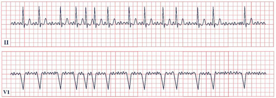 Paraclinical diagnosis. Blood samples should be collected immediately after an acute chest pain episode in the emergency room, in order to quantify histamine levels, which are only available for about 8 min. Serum tryptase is an emerging biomarker secreted by mast cells, which should be quantified every 30 min for the next 2 h, in order to rule out or confirm the allergic reaction [29]. Although increased histamine levels are characteristic, physicians might not always be able to obtain them in time and they should not be considered the gold standard for diagnosis. Serum tryptase, on the other hand, is peaking at approximately 90 min and it is a more promising biomarker [30]. Electrocardiographic findings can be nonspecific, with the most common resembling the ECG changes of digoxin toxicity, such as ST-segment depression, atrial fibrillation, bigeminal rhythm, QRS complex prolongation, QT-segment prolongation, ventricular ectopic beats, T wave inversion or flattening, sinus tachycardia, AV block, sinoatrial block, or ventricular fibrillation (Figure 3) [31]. The cardiac enzymes (troponins, CK, CK-MB) will be elevated, due to the myocardial injury. Echocardiography and coronary angiography should be performed to rule out any existing or newly installed pathologies of the myocardium and to visualize the coronary arteries. Single-photon emission computed tomography (SPECT) using thallium-201 and 125I-15-(p-iodophenyl)-3-(R, S) methylpentadecanoic acid can also be used, which will reveal the myocardial ischemia. Dynamic MRI and delayed contrast-enhanced MRI can contribute to the diagnosis [29].