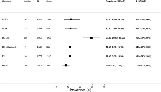 Pooled prevalence of cardiac impairment in adults with HIV infection. Reproduced with permission from: Erqou et al., J Am Coll Cardiol HF 2019;7:98–108 [11]. CI: confidence interval; DCM: dilated cardiomyopathy; DD: diastolic dysfunction; LVSD: left ventricular systolic dysfunction; PH: pulmonary hypertension; RVSD: right ventricular systolic dysfunction.