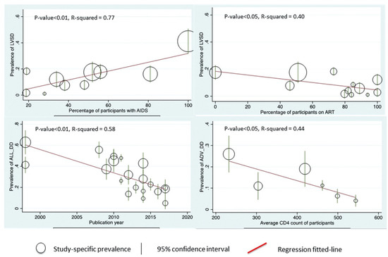 Meta-regression analysis of left ventricular systolic dysfunction (LVSD) and diastolic dysfunction (DD) by various characteristics. Reproduced with permission from: Erqou et al., J Am Coll Cardiol HF 2019;7:98–108 [11]. ALL_DD: All diastolic dysfunction; ART: antiretroviral therapy; ADV_DD: advanced diastolic dysfunction; CD4: CD4 T cell count; CI: confidence interval; DD: diastolic dysfunction; LVSD: left ventricular systolic dysfunction.