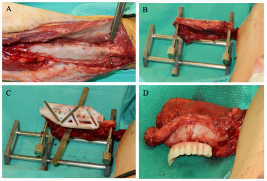 (A) Fibula was re-exposed, and removal of the Gore-Tex® membrane revealed the newly attached epithelial tissue around the implants and along the lateral sides of the fibula. (B) The flap was placed into a fibular holder (Southern Implants, Irene, South Africa) so that the flap could be safely manipulated during surgery while remaining vascularized. (C) The surgical cutting guide was repositioned on the implants, and the fibula was further osteotomized. (D) Proper configuration of the bone segments was established, with the interim dental prosthesis on the osseointegrated implants. The construct was relocated to the jaw and the flap was plated to the jaw using mini plates.