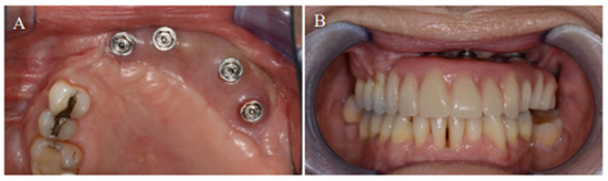 (A) Complete osseointegration of the dental implants into the neomandible. (B) Placement of the final acrylic dental prosthesis).