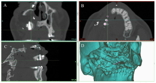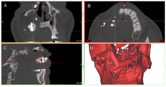 Postoperative CT scan showing the actual position of dental implants in the reconstructed jaw in the (A) coronal, (B) axial, and (C) sagittal planes. (D) 3D model showing final jaw reconstruction with implants in their actual position.