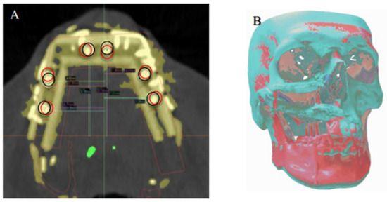 (A) Superimposition of the planned (black circles) dental implant locations according to virtual reconstruction planning and actual (red circles) implant locations on the postoperative CT. (B) Registration of the preoperative 3D model and the postoperative 3D reconstruction, showing overall deviation from the virtual plan.