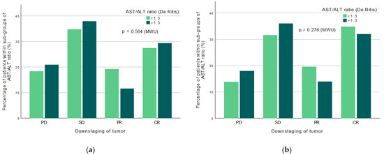 There is no significant relationship between the downstaging of primary tumor and a high De Ritis ratio > 1.3 (p = 0.564 MWU) either in the entire cohort (Figure 5a) or in NAC-receivers only (Figure 5b) (p = 0.276 MWU). A visible difference can be seen in distribution between the downstaging grades, where NAC-receivers have a higher percentage of increased downstaging within the survival markers of CR and PR (Figure 5b), compared to the entire cohort (Figure 5a).