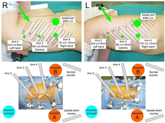 - Sakakura, N.; Nakada, T.; Shirai, S.; Takahara, H.; Nakanishi, K.; Matsui, T.; Ueno, H.; Takahashi, Y.; Kuroda, H. Robotic open-thoracotomy-view approach using vertical port placement and confronting monitor setting. Interact. Cardiovasc. Thorac. Surg. 2021, 33, 60–67. [Google Scholar] [CrossRef] [PubMed]