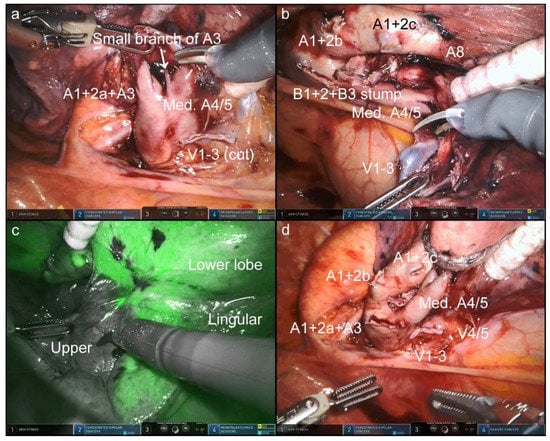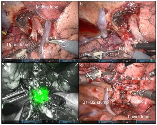 - Jiao, W.; Zhao, Y.; Qiu, T.; Xuan, Y.; Sun, X.; Qin, Y.; Liu, A.; Sui, T.; Cui, J. Robotic bronchial sleeve lobectomy for central lung tumors: Technique and outcome. Ann. Thorac. Surg. 2019, 108, 211–218. [Google Scholar] [CrossRef]