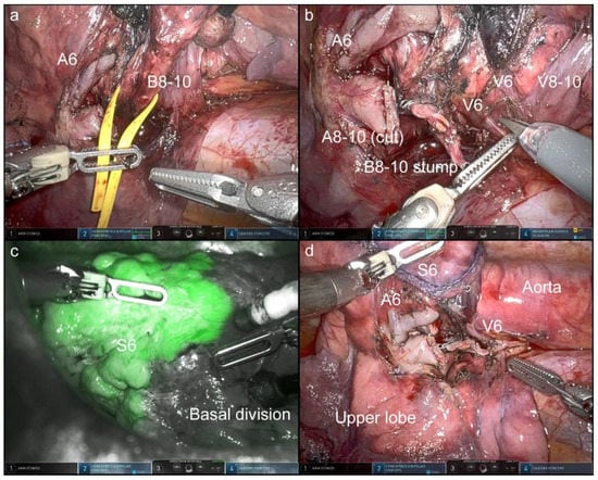 Left lower basal divisionectomy (Video S4). After the basal pulmonary artery was cut, the basal bronchus was dissected (a). Dissection of pulmonary veins (b). Segmental boundaries were clearly identified after the intravenous administration of indocyanine green (c). The completion of the procedure (d).