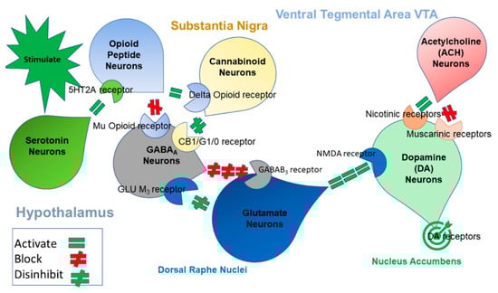 Illustrates the interaction of at least six major neurotransmitter pathways involved in the brain reward cascade (BRC). In the hypothalamus, environmental stimulation causes the release of serotonin, which in turn, via, for example, 5HT-2a receptors, activates (the green, equal sign), the subsequent release of opioid peptides into the hypothalamus. Then, the opioid peptides have two distinct effects, possibly via two different opioid receptors. (A) inhibits (the red hash sign) through the mu-opioid receptor (possibly via enkephalin) and projects to the substantia nigra to GABAA neurons. (B) stimulates (the green, equal sign) cannabinoid neurons (e.g., anandamide and 2-archydonoglcerol) through beta-endorphin linked delta receptors, which in turn inhibit GABAA neurons at the substantia nigra. cannabinoids, primarily 2-archydonoglcerol, when activated, can also indirectly disinhibit (the red hash sign) GABAA neurons in the substantia nigra through activation of G1/0 coupled to CB1 receptors. Similarly, glutamate neurons located in the dorsal raphe nuclei (DRN) can indirectly disinhibit GABAA neurons in the substantia nigra by activating GLU M3 receptors (the red hash sign). GABAA neurons, when stimulated, will, in turn, powerfully (the red hash signs) inhibit ventral tegmental area (VTA) glutaminergic drive via GABAB3 neurons. Finally, glutamate neurons in the VTA will project to dopamine neurons through NMDA receptors (the green, equal sign) to preferentially release dopamine at the NAc shown as a bullseye indicating well-being (with permission Blum et al. [2]).