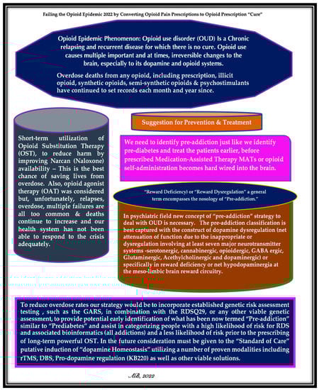 - Downs, B.W.; Blum, K.; Baron, D.; Bowirrat, A.; Lott, L.; Brewer, R.; Boyett, B.; Siwicki, D.; Roy, A.K.; Podesta, A.; et al. Death by Opioids: Are there non-addictive scientific solutions? J. Syst. Integr. Neurosci. 2019, 5. [Google Scholar] [CrossRef]