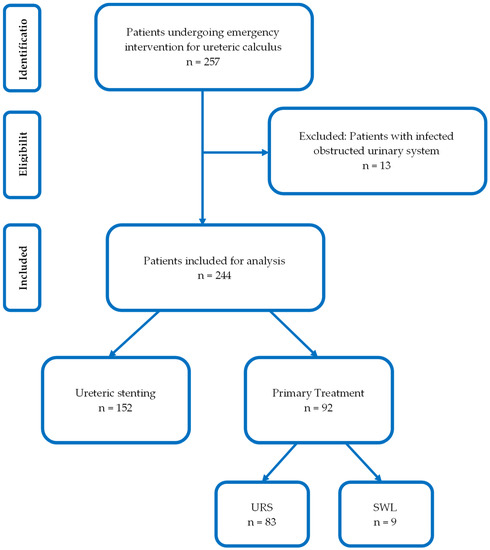 The current study included 257 patients who required emergency intervention for ureteric calculi. Among these, 13 patients presented with an infected obstructed urinary system and thus were excluded from analysis. A total of 244 patients were included in the final analysis. Retrograde ureteric stenting was performed in 152 patients (62.3%) and primary treatment in 92 patients (37.7%), of which: 83 patients (34.0%) underwent emergency URS and 9 patients (3.6%) had SWL (Figure 1).