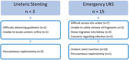 Primary URS was unsuccessful in 15 cases (18%) compared to ureteric stenting, which failed in 3 cases (2.0%). Reasons for treatment failure and subsequent treatment are summarised in Figure 2. On further analysis of these patients, stone size and position were not significant risk factors for treatment failure.
