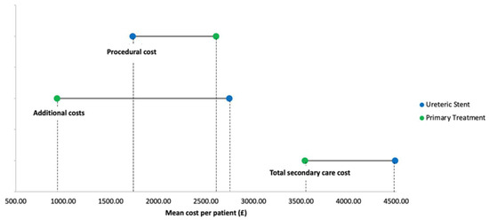 The total secondary care cost up to and including the patient’s definitive stone treatment was higher in the ureteric stenting group (mean cost GBP 4485.42) than in the primary treatment group (mean cost GBP 3536.83), but this was not statistically significant (mean difference GBP 948.59; p = 0.65). A summary of cost outcomes is displayed in Figure 3.