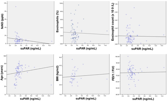 Correlation analysis between suPAR levels and age, body mass index (BMI), T2 biomarkers, and forced expiratory volume in the first second (FEV1)/ forced vital capacity (FVC). Note: No correlation was found between suPAR levels and fractional exhaled nitric oxide (FeNO) (r = −0.014, p = 0.308), eosinophils % (r = −0.037, p = 0.767), eosinophil count (r = −0.016, p = 0.895), age (r = 0.14, p = 0.238), BMI (r = 0.079, p = 0.646)), and FeV1/FVC (r = 0.020, p = 0.870). Abbreviations: BMI, body mass index; FeNO, fractional exhaled nitric oxide; FeV1/FVC, forced expiratory volume in the first second/forced vital capacity.