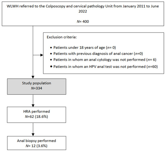 We present a single-center, observational, cross-sectional study performed from January 2011 to June 2022 at the Colposcopy and Cervical Pathology Unit of Hospital Universitario 12 de Octubre, Madrid, Spain. WLWHs who were referred for cervical cancer screening or follow-up for a history of cervical H-SIL and underwent concomitant anal cytology and anal HPV testing were enrolled. Patients were excluded who were under 18 years of age with a previous diagnosis of anal cancer and/or in whom neither anal cytology nor anal HPV testing was performed.
