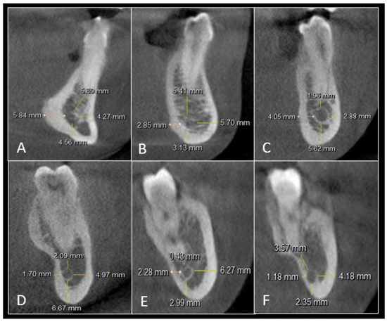 Cross-sectional view showing linear measurements of IAC with the root apex, BCP, inferior border of the mandible, and LCP in: (A) mandibular canine, (B) mandibular first premolar, (C) mandibular second premolar, (D) mandibular first molar, (E) mandibular second molar, and (F) mandibular third molar.