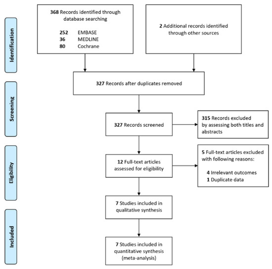 A total of 370 studies were identified through a database search along with two additional manual searches (Figure 1); 43 duplicate records were removed, and 315 were excluded after assessing both titles and abstracts. After the full texts of the 12 remaining articles were reviewed, we excluded five articles for the following reasons: irrelevant outcomes (n = 4) and duplicate data (n = 1). Finally, seven observational studies that enrolled total 3837 patients were included in the meta-analysis [13,14,15,23,24,25,26]. The reasons why potentially relevant studies failed to meet the eligibility criteria are presented in Supplementary Table S2.