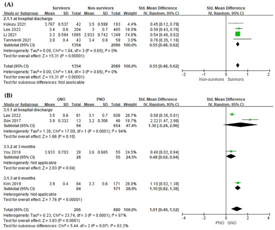 The serum albumin level was significantly higher in the GNO group than in the PNO group (four studies; SMD = 1.01, 95% CI = 0.49–1.52, I2 = 87%; p < 0.001, Figure 2B).
