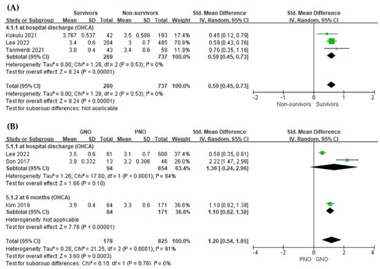 A meta-analysis of neurologic outcome was performed separately for studies that included only OHCA patients, and this analysis showed a significant difference between the two groups (p < 0.001, Figure 3B).