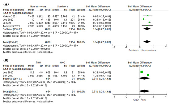 The serum lactate level was found to be significantly higher in non-survivors than in survivors, showing a negative association with an overall SMD ([mean value in the survivors − mean value in non-survivors]/pooled SD) of 0.54 (95% CI, 0.27–0.82; I2 = 87%; p < 0.001, Figure 4A).