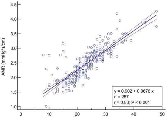 Correlation and the linear regression between AMR and IMR. AMR values (y axis) showed good correlation (r = 0.83, p < 0.001) with IMR (x axis). The red dotted line represents the 95% CI of the linear regression equation that was quantified as AMR = 0.90 + 0.07 × IMR. AMR, angio-derived microcirculatory resistance; IMR, index of microvascular resistance.