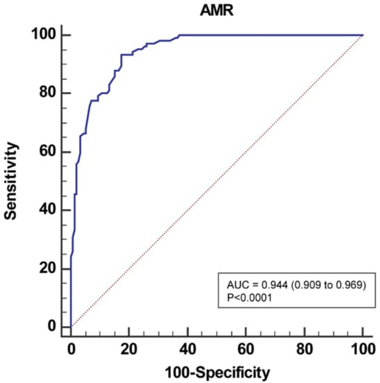 At the ROC analysis (Figure 2), the area under the curve of AMR in predicting IMR ≥ 25 was 0.94 (95% CI: 0.91 to 0.97), with a sensitivity of 93.5% (87.0–97.3), a specificity of 82.7% (75.6–88.4), a positive predictive value of 79.4% (71.2–86.1) and a negative predictive value of 94.7% (89.3–97.8). Positive and negative likelihood ratios were 5.39 (3.80–7.70) and 0.08 (0.04–0.20), respectively, as shown in Table 3. AMR yielded an overall diagnostic accuracy of 87.2% (95% CI: 83.0% to 91.3%).