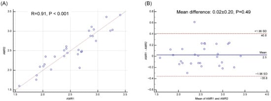 Reproducibility of AMR analysis. Correlation (A) and agreement (B) of AMR analyzed by two blinded investigators.
