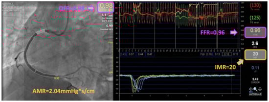 On the other hand, previously reported angiography-derived IMR indexes were based on QFR computation from two angiographic projections, which is not devoid of several limitations. Firstly, it requires two angiographic views with at least 25° separation from each other, and with minimal vessel foreshortening and overlap. Secondly, a linear tapering of the reference vessel size is assumed during QFR computation, with reduced accuracy in specific settings (i.e., bifurcation lesions). Conversely, the novel μQFR, besides being derived from a single angiographic projection, provides an artificial intelligence-empowered delineation of vessel contours, frame counting, and a more accurate reconstruction of reference vessel size, with a fast and reproducible computation, all of which reduce operator-dependence of the measurement []. Interestingly, in our study, retrospective analysis of both μQFR and AMR was feasible in the vast majority of the cases (~85% as provided in Supplementary Figure S1), whilst two-view QFR analysis was reported to have lower feasibility in retrospective analysis, with half of the cases not analyzable, due to the lack of a second appropriate angiographic projection [,].