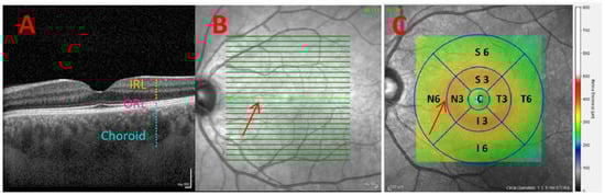 (A) Tomographic image of the central B-scan indicating inner retinal layer (IRL), outer retinal layer (ORL), and choroid. (B) 25 B-scans at 30° centered on the fovea, indicating the selected one with the red arrow. (C) The 9 Early Treatment Diabetic Retinopathy Study (ETDRS) areas for a left eye.