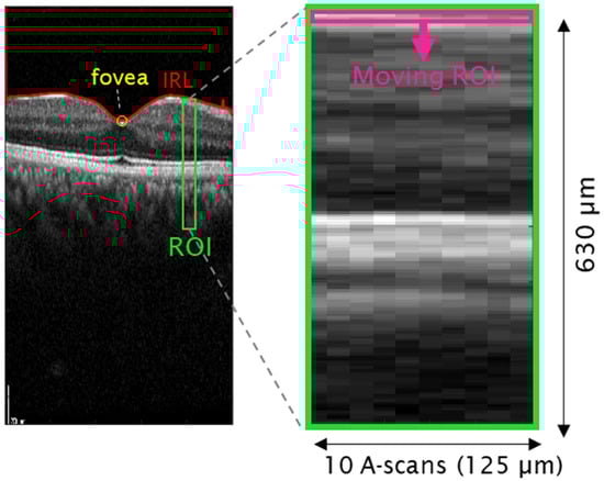 The method of data analysis consisted of three main steps: (1) IRL segmentation and fovea location, (2) speckle contrast estimation, and (3) layer thickness evaluation. The process of IRL segmentation consists of various steps. First, median filtering was applied as a smoothing technique to eliminate noise from the image. Border detection using Canny edge detection was then implemented. After border detection (red line in Figure 2), fovea was located as the minimum value of the detected IRL border (yellow circle in Figure 2). The region of interest (ROI) was fixed on the border between parafoveal and perifoveal regions (Figure 1C); this is approximately 1.5 mm away from the macula nasally, with a fixed dimension of 140 × 10 pixels (green rectangle in Figure 2). The axial dimension of the ROI was set to 140 pixels from the IRL border. This corresponds to 630 µm approximately, which includes the whole retina and part of the choroid. The lateral dimension of the ROI was fixed to 10 A-scans (i.e., 10 pixels). After ROI selection, a moving ROI was defined within the main ROI. The moving ROI had fixed dimensions of 1 × 10 pixels, and a moving step of 1 pixel (pink rectangle in Figure 2).