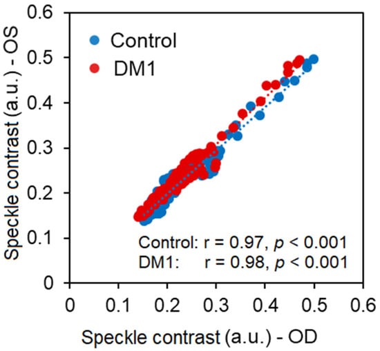 No statistically significant difference was found between left (OS) and right eyes (OD) in contrast to speckle estimation for any of the groups under analysis (OD vs. OS (paired t-test): DM1 p = 0.88, and control p = 0.78). Similarly, a strong correlation was found between left and right eyes in speckle contrast for both groups (DM1 r = 0.97 and control r = 0.98, both p < 0.001, Figure 3). Consequently, for simplicity, results are shown for the right eyes only, unless otherwise stated.