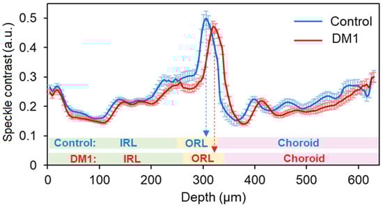 Mean speckle contrast expressed in arbitrary units (a.u.) for the control group (n = 32), in blue, and for the DM1 group (n = 42), in red. Error bars represent standard error. In the bottom part of the plot mean layer thickness per group is shown. Dashed arrows indicate the maximum speckle contrast position per group.