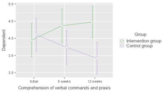 Although no significant differences were found in the general cognitive level of both groups after the treatment, an additional analysis was carried out to assess whether some of the cognitive functions assessed in the Lobo Mini Cognitive Test underwent any change. As a result of this analysis, we found that in relation to the comprehension of verbal commands and praxis dimension (Figure 2), both groups started from similar values but followed different evolutions (p = 0.042), so that the intervention group obtained statistically significant improvements at week 5 (p = 0.021) and these improvements were maintained at follow-up (p = 0.009).