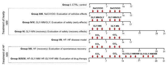 Schematic representation of the experimental groups. The horizontal axis indicates days of treatment and the last number on the horizontal axis is the day of the animal sacrifice. Arrows indicate intraperitoneal injections and the drug and/or solution administered (NaCl: sterile 0.9% NaCl; VOO: sterile virgin olive oil; GLY-MN: encapsulated LY2157299; GLY: free LY2157299; CCl4: CCl4, 40% in sterile virgin olive oil.
