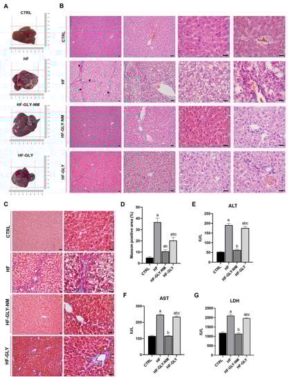 Effects of GLY and GLY-MNs on liver morphology and function. (A) Representative images of livers from CTRL (Group I), HF (Group VII), HF-GLY-NM (Group IX) and HF-GLY (Group X). (B) Haematoxylin and eosin staining of liver sections. Arrow indicates typical irregular shape of liver lobules during fibrosis (scale bar: 10 μm). (C) Masson’s trichrome staining of liver sections (scale bar: 10 μm). (D) Quantification of Masson’s trichrome positive areas. The amount of interstitial fibrosis was measured by quantifying the collagenous fibrotic areas stained in blue/green in 10 random liver fields per section from four different rats for each group. Images were analysed by using multiphase image analysis ImageJ with a software version 1.49s. Values are expressed as mean ± SD. (E) Alanine Transaminase (ALT), (F) aspartate transaminase (AST) and (G) lactate dehydrogenase (LDH) activities. Values are expressed as mean ± SD (n = 8). Significative values were reported with respect to Group I CTRL, a = p < 0.05; to Group VII HF, b = p < 0.05; to Group IX HF-GLY-NM, c = p < 0.05.