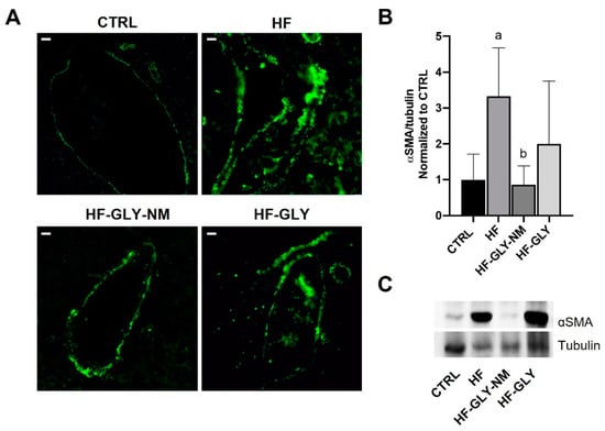 Activation of HSCs is another feature of liver fibrosis that was checked by immunofluorescence of α-SMA [48]. Livers from control animals (Group I CTRL) showed a discrete positive α-SMA cells in the perisinusoidal spaces and vascular walls whose fluorescence intensity and area increased in the fibrotic liver as sign of HSCs activation, in agreement with Zhang and co-workers [48] (Figure 3A). In agreement with what they reported for liver morphology and function, the injection of GLY-NM, but not of GLY, to CCl4-induced HF rats significantly reduced α-SMA-positive area, thus suggesting a reduction of activated HSCs.