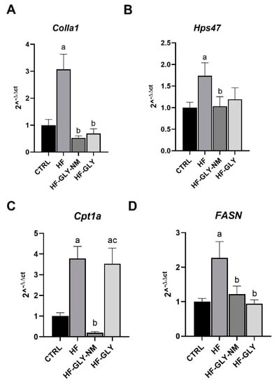 To corroborate the histopathological analysis with quantitative data, the protein content of α-SMA and the expression of genes involved in HF, i.e., collagen type I, α 1(ColIa1) and heat shock protein 47 (Hsp47) were evaluated together with genes encoding for enzymes involved in fatty acid metabolism, i.e., fatty acid synthase (FASN) and carnitine palmitoyltransferase 1a (Cpt1a). ColIa1, Hsp47 and α-SMA in the rat experimental models are induced by TGF-β1. TGF-β1 is a key profibrogenic cytokine in liver fibrosis which triggers the morphological hepatic changes and ECM production [49]. Biochemical data are in accordance with histopathological analysis. In fact, they are also in agreement with the increased fluorescence area of α-SMA in livers of CCl4-induced HF rats and also the 3-fold α-SMA protein increase, suggesting activation of HSCs (Figure 3A–C). After administration of the drug to CCl4-induced HF animals, the protein level of α-SMA was comparable to that observed in control rats when injected with GLY-NM. On the contrary, injection of GLY was not able to counteract the effects of CCl4 (Figure 3B,C). Moreover, only a partial recovery in the α-SMA protein values was observed similar to control rats (about 2-fold induction) in those rats left to recover for two weeks after the last CCl4 injection or treated with empty MN (Supplementary Figure S1C,D). ColIa1 and Hsp47 mRNA levels were higher in CCl4-induced HF animals than in control ones, confirming the fibrosis process (Figure 4A,B). When these animals were administrated with GLY or GLY-NM, both treatments reduced ColIa1 and Hsp47 to the same extent, thus not highlighting a difference, at least in the mRNA contents (Figure 4A,B).