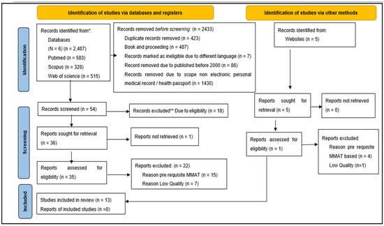 Based on the formulated research question, three main keywords were identified: Benefit, personal digital health records, and potential user. To enrich these keywords, the authors sought their synonyms, related terms, and variations by using APA, a thesaurus, and index terms to the keywords used by past studies, referring to the keywords suggested by Scopus and asking the opinion of experts. The list of keywords is tabulated in Appendix A. Based on this process, several MeSH term keywords similar to benefit, health passport, and potential user in primary care, including advantage, cost benefit, usage, acceptance, acceptable, acceptability, efficiency, success, useful, efficacy, use, effectiveness, helpful, value, usability, adaptation, adaptable, adaptability, Digital Personal Health Record, Digital Personal Health Information, Digital Personal Medical Record, Digital Personal Dental Record, Personal Health Record, Personal Health Information, Personal Medical Record, Personal Dental Record, Digital Mobile health app, Digital mobile dental app, Primary care User, Primary care Operator, Primary care Worker, Primary care Patient, Primary healthcare Operator, Primary healthcare Worker, Primary Healthcare Patient, Primary Healthcare provider, Healthcare provider, Healthcare professional, Primary Healthcare professional, Primary health care Operator, outpatient, Doctors, nurse, dental nurse, dental therapist, dental hygienist, dentist, medical assistance, nurse midwife, and health care provider, were checked. The combinations of these keywords were processed using search functions, such as field code functions, phrase searching, wildcards, truncation, and Boolean operators, in five databases: Scopus, Web of Science, PubMed, EBSCO—Medline, and Google Scholar. The detailed keyword search is presented in Appendix B. Based on the search, 2487 potential articles were identified from the selected databases. In addition, five articles were selected based on reference mining.