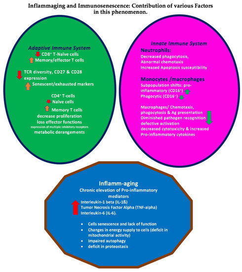 It is not surprising that immune deterioration and inadequate function due to aging occur in both arms of the immune system, namely innate and adaptive immunity [211,212,213,214,215].
