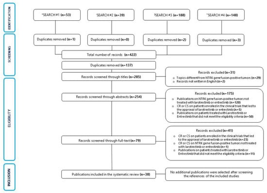We included CR and CS on pediatric and adult patients affected by locally advanced or metastatic NTRK gene fusion-positive solid tumors treated with larotrectinib or entrectinib. Only publications in English or European languages were considered. Furthermore, CS were deemed eligible only if single-case descriptions were provided. Letters to the editor or other types of publications reporting CR or CS were also considered if they satisfied all the previous criteria. On the contrary, CR and CS on NTRK gene fusion-positive solid tumor patients treated with TRK inhibitors not yet approved by the FDA were excluded. In addition, eligible publications reporting on patients enrolled in the clinical trials that led to the approval of larotrectinib and entrectinib were excluded, as well [,]. Indeed, this systematic review aimed to create a virtual cohort of patients different from the populations enrolled in the clinical trials. Finally, patients who received TRK inhibitors through an early access program or were enrolled in observational or non-interventional clinical trials (e.g., post-marketing safety surveillance studies) were considered eligible.