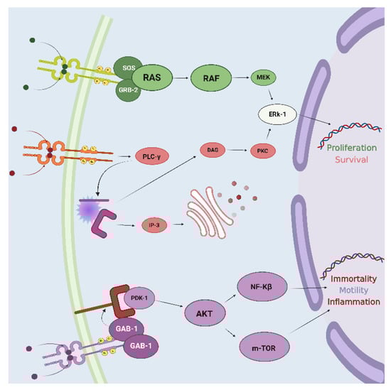 TRK receptors’ intracellular signaling pathway. The interaction between the receptor and the ligand activates crosstalk between multiple intracellular molecular cascades. Abbreviations: protein kinase B (AKT); Diacylglycerol (DAG); Extracellular signal-regulated kinase (ERk-1); GRB2-Associated Binding Protein-1 (GAB-1); Growth Factor Receptor-Bound Protein-2 (GRB-2); Inositol trisphosphate (IP-3); Mitogen-activated protein kinase (MEK); Mammalian Target of Rapamycin (m-TOR); Nuclear Factor Kinase-β (NF-Kβ); 3-Phosphoinositide-Dependent Protein Kinase-1 (PDK-1); Protein Kinase C (PKC); Phospholipase C-γ (PLC-γ); Rapidly Accelerated Fibrosarcoma (RAF); Rat Sarcoma virus (RAS); Son of Sevenless (SOS). Created with BioRender.com.