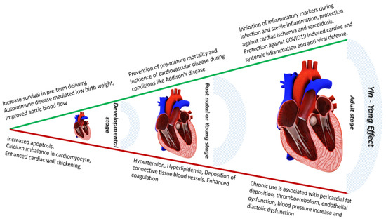 Glucocorticoids are innately known as the stress hormones which are also endogenous anti-inflammatory agents. Their presence in systemic circulation and tissues at various stages of the life cycle, from development to adulthood, have been extensively studied. GCs belong to the class of essential hormones required for our growth and systemic and metabolic homeostasis [1,2]. At the same time, when it is present in excess, it could trigger some detrimental effects on cardiovascular and systemic health [3,4,5,6,7,8,9,10,11,12,13,14,15,16,17,18]. In this review, we will go in detail to analyze the Yin-Yang effect of GCs at various life stages to understand how important it is to maintain a GC homeostasis to preserve cardiovascular health.