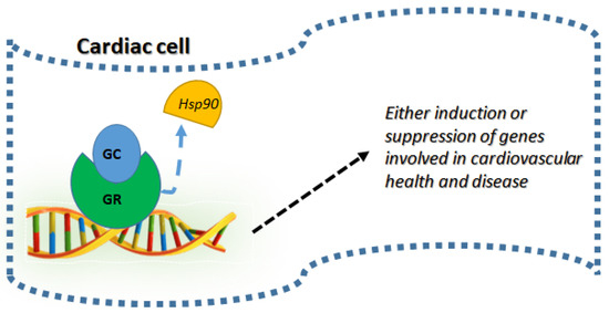 Cellular mechanism of GC on cardiovascular tissue: Following the ligand binding (GC) to GR, they detach from the chaperones such as heat shock protein 90 (Hsp90) undergoing nuclear translocation and DNA binding to either induce or suppress gene targets which are involved in cardiac health and diseases.