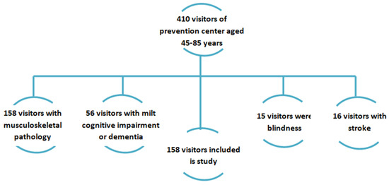 The study was conducted in the medical prevention office of the Center for Public Health and Medical Prevention for one-quarter of 2022. All patients who were 45–85 years old, who have signed informed consents, with no exclusion criteria were included in the study (Figure 1). Of the many criteria, those that could affect the results of the study have been chosen, meaning that it is they, not sarcopenia, that will determine the results obtained even as early as the first stage of randomization, which would violate the purity of the experiment. Vital functions, including blindness, can affect physical activity and muscle mass. In this regard, the status of these functions was necessarily taken into account during randomization. Exclusion criteria: pregnant women, alcohol abusers, patients with liver diseases, respiratory and cardiovascular systems, gastrointestinal tract in decompensation stage, musculoskeletal pathology, moderate-or-severe cognitive impairment, and immobilization in the last 6 months. A total of 460 patients were included in the study. Of all included patients, 158 were excluded due to musculoskeletal pathology, 56 had cognitive impairment of moderate severity or dementia, 15 had blindness, and 16 had stroke. A total of 221 people aged 45 to 85 years participated, including 145 women and 56 men (the predominance of women in the study is associated with more frequent use of medical care for disease prevention).