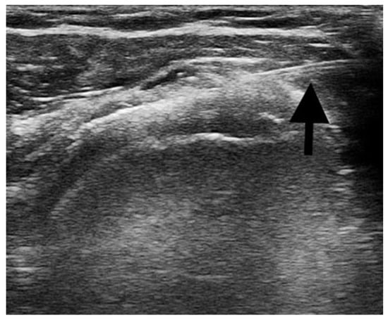 - Ultrasound-guided injections: the procedures were performed with the patient supine and positioned with the shoulder adducted and slightly extra rotated, the upper limb laying along the side. A US machine (Mindray® M7 Bio-Medical Electronics Co, Ltd., Shenzhen, China) with a linear transducer (8–12 MHz) was used to identify the subacromial bursa and to guide the injection procedure. After the preparation of the sterile field, a US-guided percutaneous injection of 1 mL of 40 mg triamcinolone acetonide combined with 3 mL of 1% lidocaine was performed in the affected subacromial bursa [,]. A 22-gauge needle was used and the correct positioning of the needle directly into the bursa was real-time confirmed under US guidance. Figure 1 shows the US image of the percutaneous injection procedure.