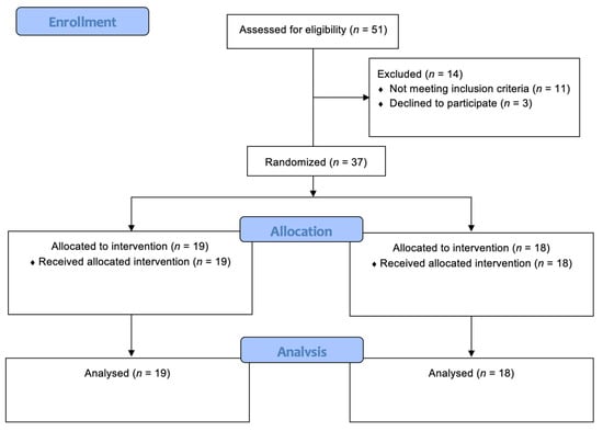 As a result, 37 patients with BC were enrolled in the study and subsequently randomly assigned to Group A and Group B. Figure 2 shows in detail the randomization process in accordance with the CONSORT guidelines for randomized controlled trials [].