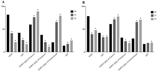 (A) Within-group differences in Group A. (B) Within-group differences in Group B. Abbreviations: * p < 0.05; T0: baseline; T1: after treatment; T2: after 3 months follow-up; EORTC QLQ-C30: European Organization for Research and Treatment of Cancer Quality of Life Questionnaire; HST: handgrip strength test; NPRS: Numerical Pain Rating Scale; OSS: Oxford Shoulder Score.