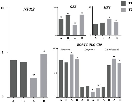 Between-group differences in the outcome measures. Abbreviations: * p < 0.05; T1: after treatment; T2: after 3 months follow up; A: Group A; B: Group B; EORTC QLQ-C30: European Organization for Research and Treatment of Cancer Quality of Life Questionnaire; HST: handgrip strength test; NPRS: Numerical Pain Rating Scale; OSS: Oxford Shoulder Score.